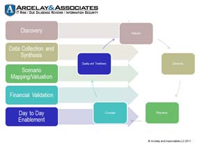 Our emphasis during the engagement phases (Discovery, Data Collection & Synthesis, Scenario Mapping/Valuation Identification, Financial Validation, and Day to day enablement) focuses on Authority, Objectivity, Relevance, Coverage, and Quality and Timeliness of the material we are evaluating. These steps give us the necessary tools to determine the overall value of the IT Organization, areas of potential synergies, areas in need of remediation, and risk and cost reduction.